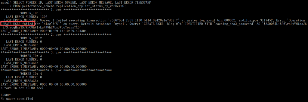 SELECT WORKER_ID, LAST_ERROR_NUMBER, LAST_ERROR_MESSAGE, LAST_ERROR_TIMESTAMP FROM performance_schema.replication_applier_status_by_worker\G;